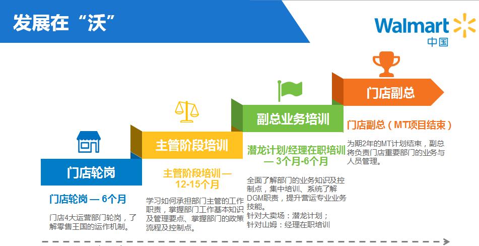 沃尔玛(中国)营运管培生项目是为了培养未来的门店管理者而设立。在项目中,你将进入沃尔玛购物广场,进行为期两年的专业学习与培训,并在两年后成长为副总经理。