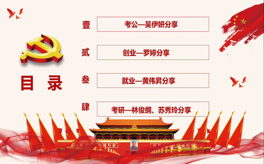吴伊妍、罗婷、黄伟昇、苏秀玲和林俊纲五位毕业生党员在此次经验交流分享会中,言传身教,就自己大学四年经历,分享其学习经验、就业创业经验,还有考公考研经验。首先,吴伊妍从公考时间线与选岗、如何备考、心态三方面讲述考公经验,关注有关公众号,了解历年选岗方面及自身情况,做到有计划有目标有落实的去备考;在心态方面要积极乐观,勇于面对困难并积极解决。随后,创业者罗婷从其实际经历出发,向大家分享在创业前期需要做好的准备:了解市场、产品定位、资源筹集、行动方案、团队成员等,更重要的是遇到问题要灵活应变,强调创业要有良好心态。接着,黄伟昇点明了大学四年各阶段的寒暑假实习计划,从其实习经验分享,指点就业的准备工作,详细的阐述了实习认知、分享实习渠道、面试的准备、面试技巧的关键点,提醒同学们要尽快明确自己的就业方向,在校期间以学业为重,多考专业证书,实习第二的观点,黄伟昇的就业分享为同学们以后的就业提供了有效的帮助。最后,考研生苏秀玲和林俊纲分享其考研经验,内容包括学硕与专硕的区别、考研动机、自我评价、专业与公司的选择、考研科目、学习方法、资料选择和作息与心态,并提及同学们要劳逸结合、做好及落实好学习计划,从而达到高效率学习,既然择了考研就要坚持到底。