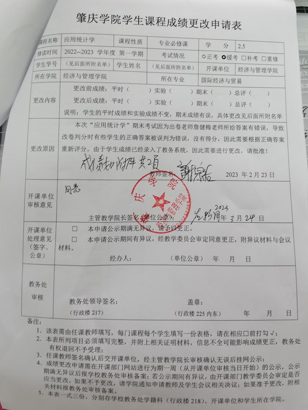 EMC易倍员工课程成绩更改申请表公示(EMC易倍-应用统计学)