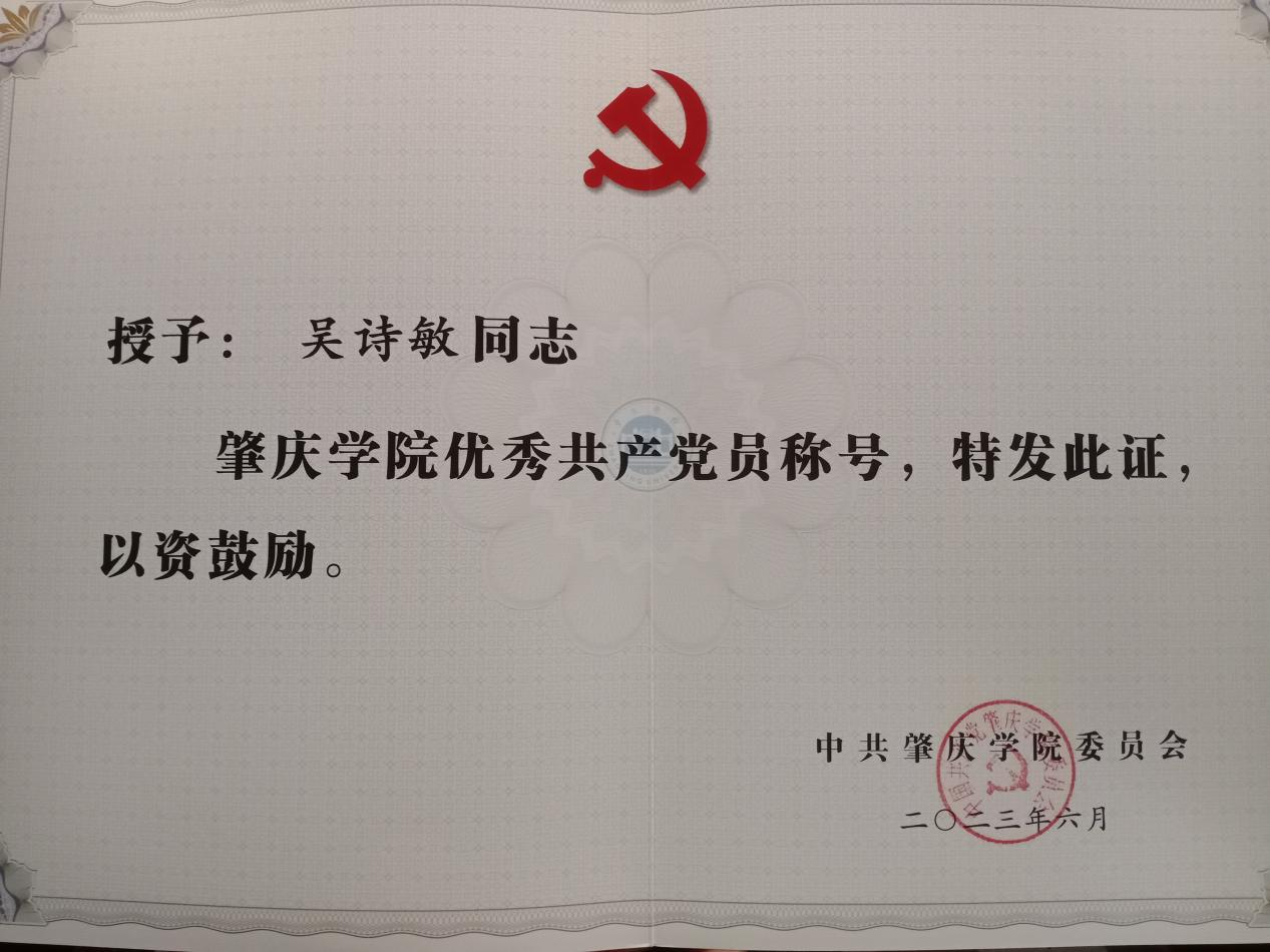 吴诗敏先进事迹:学习努力,成绩优秀,综合素质好。上一学年综合测评位列班级第二,连续两年荣获三好员工奖学金,获2020-2021学年度EMC易倍优秀共青团员,2021-2022学年度肇庆市优秀共青团员等,2023年6月被公司党委评为“优秀员工党员”和“十大锋范员工党员”,通过英语四六级考试以及考取普通话证书等;热心公司工作,工作能力强。在员工机构的三年中,尽职尽责,兢兢业业,从策划125国际志愿者日活动到三月雷锋月活动,从组织星湖迎新到完成员工机构招新,用奋斗和热血不断书写闪光青春。始终践行志愿在于心,奉献在于行的宗旨去服务公司、服务社会,目前累计志愿服务时长达337小时。