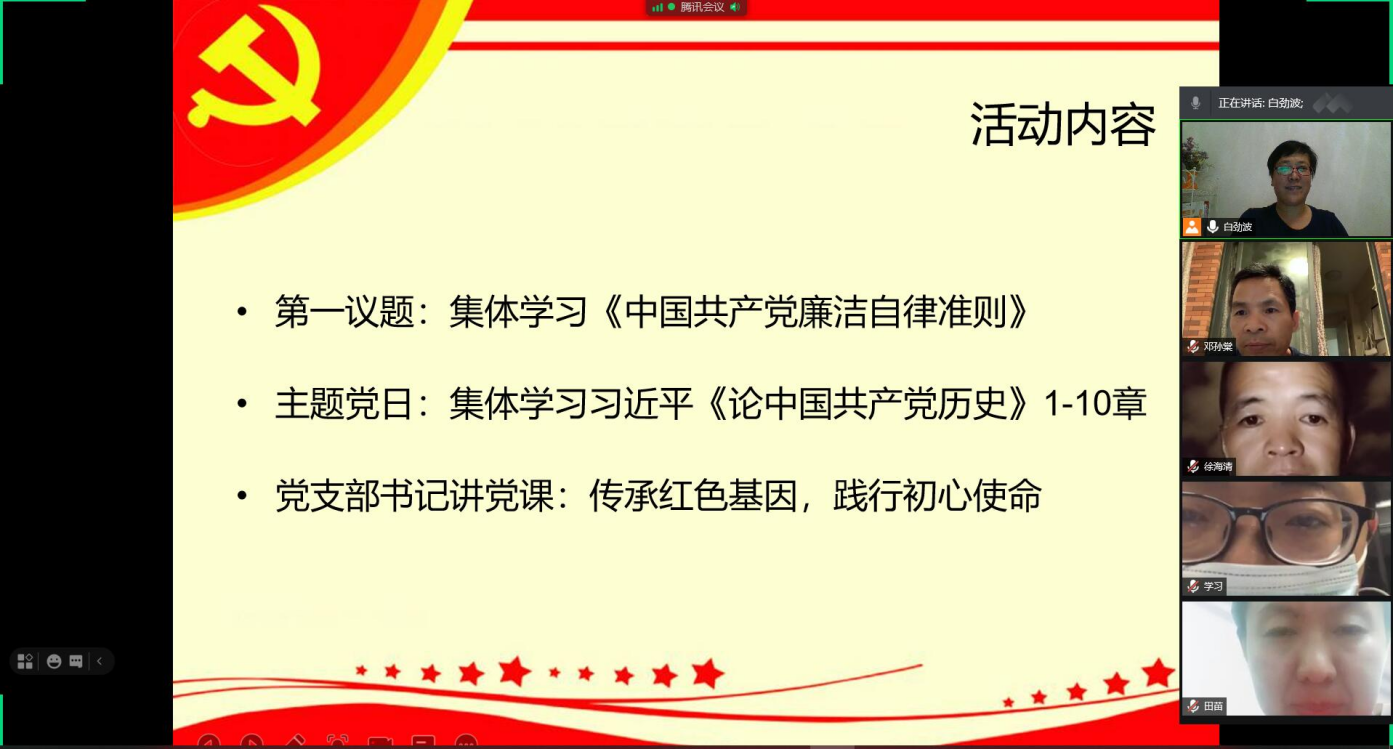 公司党委每个月都会印发党支部开展组织活动的通知,通过“第一议题”学习的方式制订当月学习主题,组织各支部学习党内法规,以党章、准则、条例为重点,结合近年来中央出台的党内法规,选择与本单位工作职能息息相关的党内法规,有针对性地进行学习。从今年3月起至今,公司党委每月都统一布置各党支部“第一议题”专题学习党内法规,分别是3月份学习《中国共产党章程》,4月份学习《中国共产党纪律处分条例》,5月份学习《中国共产党廉洁自律准则》。共计422人次党员参与了学习,公司党委共计派发学习资料《中国共产党章程》220本。